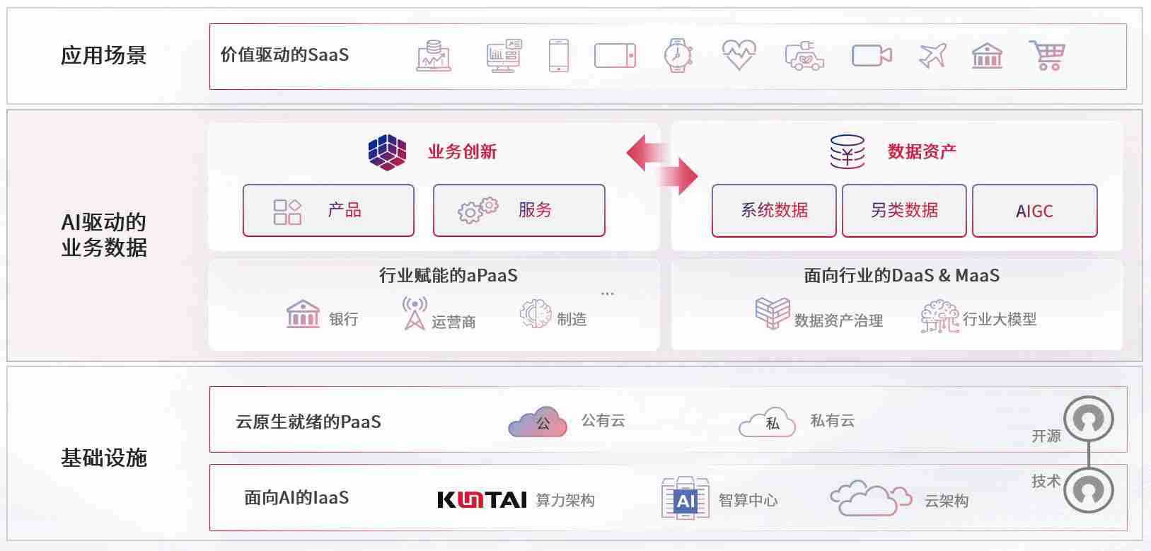 数字时代,,围绕企业数字化转型的关键要素,,尊龙z6数码开创性的提出数云融合战略和技术体系框架,,着力在云原生、、、、数字原生、、、、AI原生和信创产业上架构产品和服务能力,,为处在不同数字化转型阶段的快消零售、、、汽车、、金融、、、、医疗、、、、政企、、教育、、运营商等行业客户提供泛在的敏捷IT能力和融合的数据驱动能力,,,构建跨界融合创新的数字业务场景和新业务模式,,助力企业级客户建立面向未来的核心能力和竞争优势,,,,全面推动社会的数字化、、、、智能化转型升级。。。。