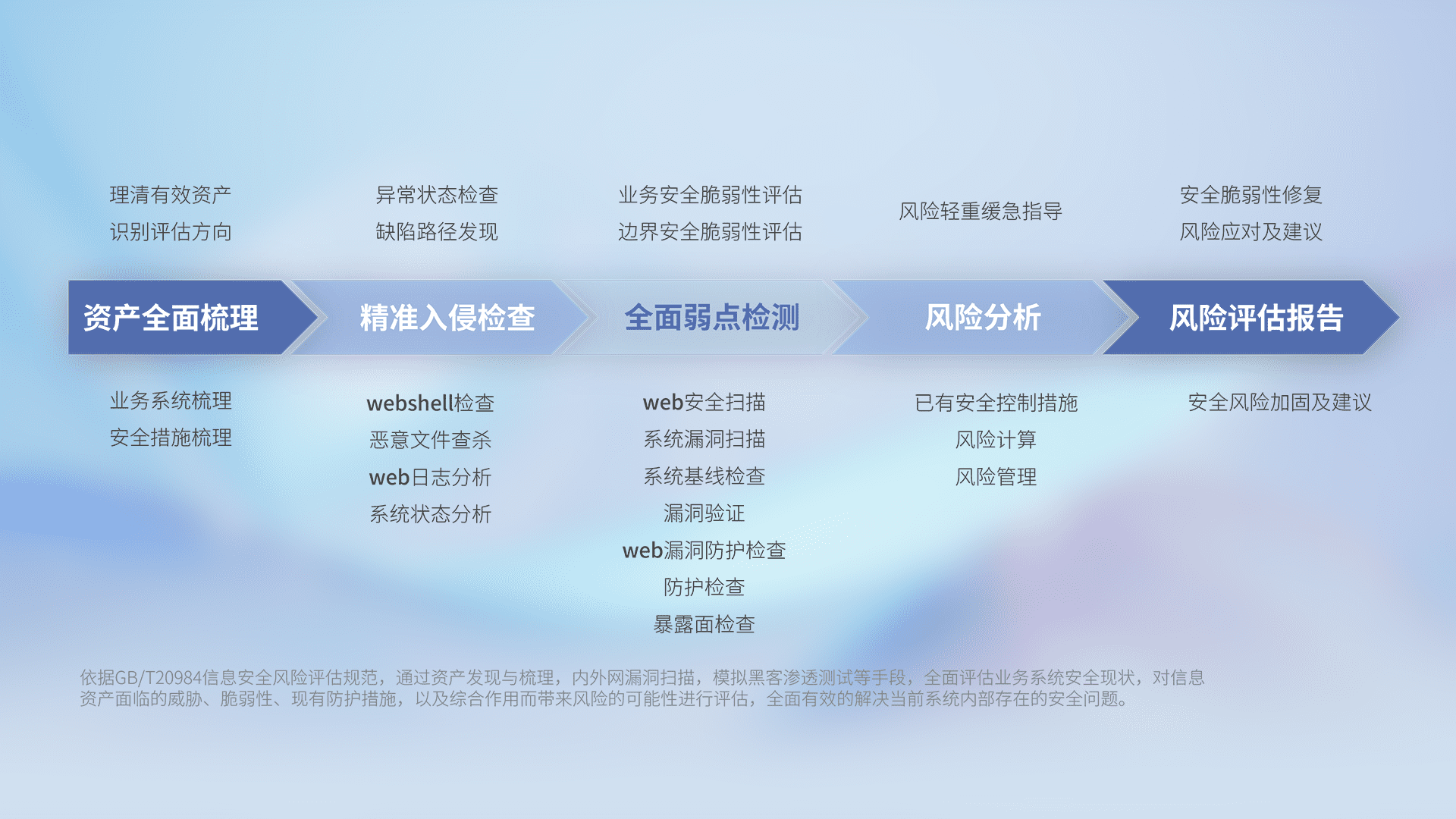 针对客户行业特性,,,,以专业的安全服务+多厂商联合解决方案提供专属的一站式安全管理服务,,,,帮助客户全面感知网络空间威胁,,,基于识别、、、、检测、、、分析、、、防护、、监测、、、响应的服务理论模型,,,,从方案咨询、、、集成交付、、评估验证、、、、优化加固、、、运维运营,,,,致力于为客户提供完整的闭环管理式安全服务。。。。以实战经验为客户打造高抵御风险的安全体系,,,帮助客户发现威胁、、、、对抗威胁、、、、处置威胁,,,,不断积累安全对抗能力,,,,持续保障数字化安全。。