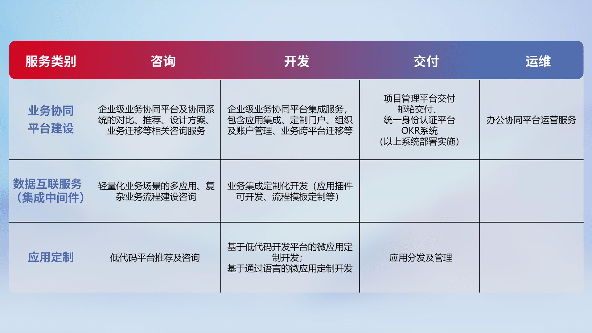 针对钉钉、、企微、、、IDaas等平台级产品提供产品的规划、、方案、、交付、、定制化开发等服务,,,实现如统一协同办公、、智能客户服务、、混合会议管理、、、、智能数据查询、、、等业务场景,,实现数字化转型。。